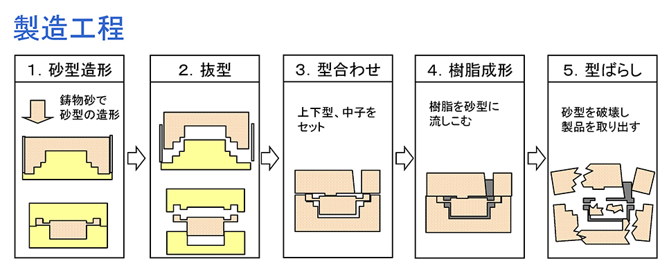 プラスチック プラスチック成型 弊社では金型によるプラスチック成形の他に、砂型鋳造、木型製作の技術を用いて、生産数が少ない製品等には砂型を用いてRIM成形を行っています。 この技術を用いる事で、金型を製作しなくてもよい為、初期投資が安価で、短納期な樹脂成形を実施する事が可能です。 ペンタム樹脂 弊社では、RIM成形にペンタム樹脂を使用しています。ペンタム樹脂の特長はジシクロペンタムジエンを主原料とした熱硬化樹脂で、極めて短時間で大型複雑な成形品を製造できる素材です。 高い物性バランスを持ち、耐食性、耐衝撃性に優れている。又、通常のFRP樹脂と異なりガラス繊維を含まない為にリサイクルが可能で、焼却しても有害物質が発生しないといった特徴を持っています。